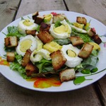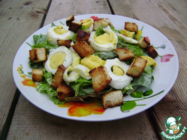 * когда яйца сварились, режем их на крупные кружочки. Выкладываем их на листья салата в чашку (только обязательно остывшие! а то листья завянут), поливаем всей заправкой.
