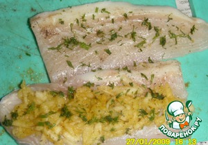 Рыбу слегка обсыпать мелко нарезанным укропом, выложить начинку