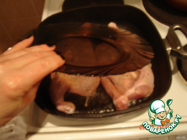 • на разогретую сковороду с маслом кладём 2 половинки цыплёнка