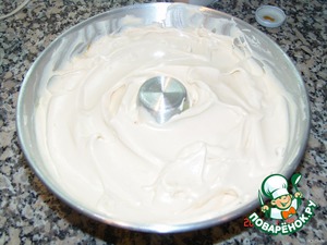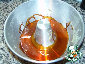 Затем, не прекращая взбивать, осторожно вводим тоненькой струйкой оставшуюся карамель. Белковая масса при этом приобретает коричневый цвет. -