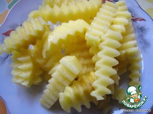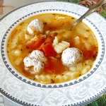 в уже сваренные фрикадельки кладу фигурно нарезанную картошку и, когда она сварится, кладу зажарку
