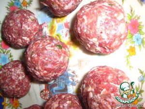 в говяжий фарш кладем измельченные в блендере или пропущенные в мясорубке: пол-луковицы, по веточке укропа, кинзы, петрушки, дольку чеснока, душицу, горсточку риса, солим, перчим и, перемешав фарш, делаем шарики (фрикаделечки).