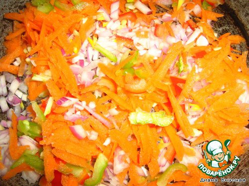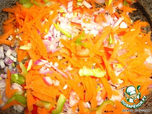 теперь для зажарки нарезаем пол-луковицы, морковь, болгарский перчик