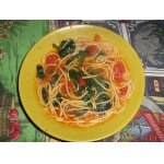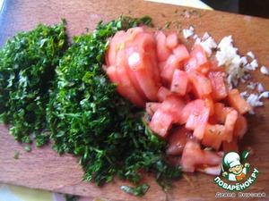 В самом конце кладу мелко нарезанные дольку чеснока, всю нашу зелень и очищенную от кожуры помидорину. Солю, перчу и - готово!