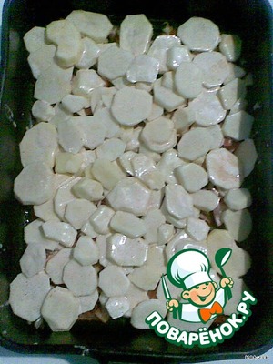 Принцип приготовления такой же как "Мясо по-французски", только с картофелем. Получается вкусненький ужин, да и на праздничный стол поставить не стыдно.