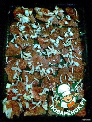 Режем лук (кому как нравится) и посыпаем мясо. -