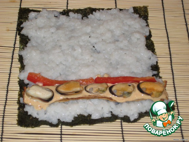 Следующий ролл - это омлет, мидии, перец сладкий и спайс-соус.