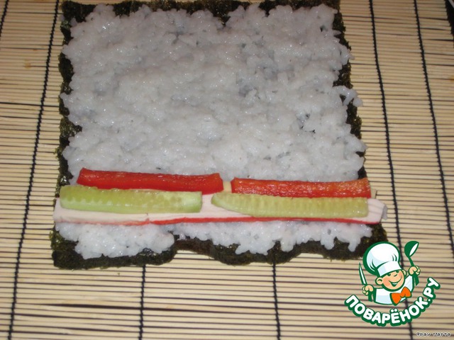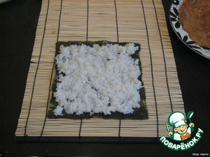 Берем циновку, на нее кладем лист нори. Сверху распределяем рис (уже остывший).