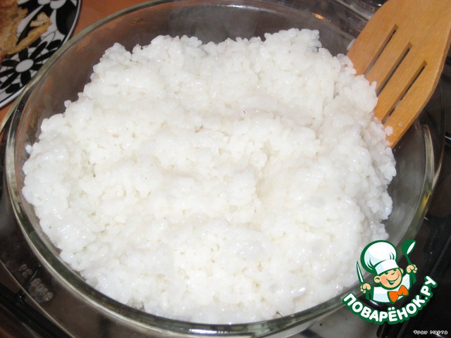 Смешать 4 ст. ложки рисового уксуса, 2 чайные ложки сахара и 2 чайные ложки соли. Немного (совсем чуть-чуть!) подогреть, развести сахар и соль до растворения и вылить в рис. Рис перемешивать только деревянной лопаточкой! -