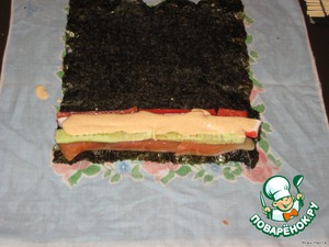 Выкладываем начинку - рыба, крабовые палочки, огурец, перец, соус-спайс.