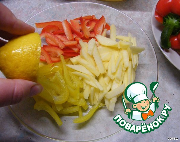 Сладкий перец очистить от семян, нашинковать соломкой. Яблоко очистить и нарезать. Подготовленные ингредиенты соединить, сбрызнуть соком лимона, перемешать.