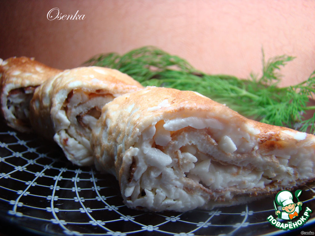 Смешать сырок с чесноком и чуть майонеза, можно добавить зелень. Этой массой смазать блинчики и свернуть трубочкой. Охладить в холодильнике. Нарезать под большым углом. Готово!
