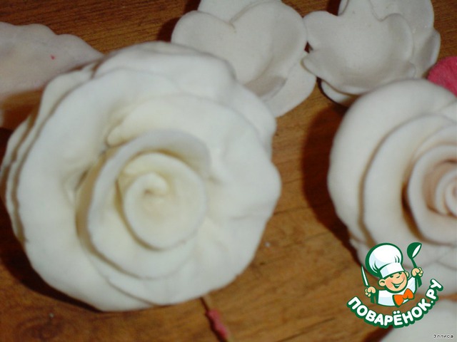 Очень красивые у вас розочки Я свои лепестки вырезала маленькой формочкой и затем тоненько раскатывала гладкой ручкой. Раскатывала в крахмале но не смотря на это вкус розочек не проиграл. Они долго оставались мягкими