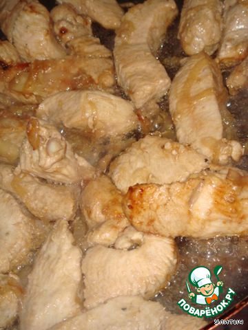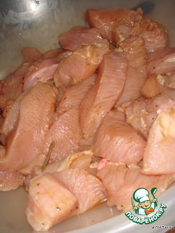 Индюшачью грудку режем на полосочки длиной 5-6 см, шириной 2 см примерно.