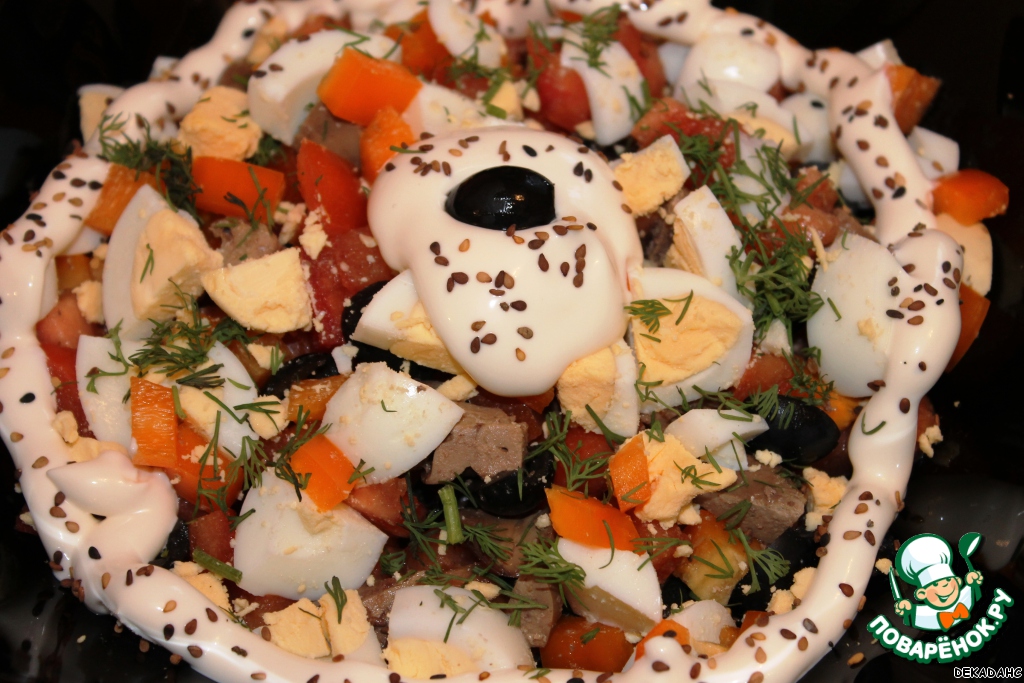 Добавить порезанные кубиками яйца, порезанные на половинки маслины и уже подготовленную печенку.