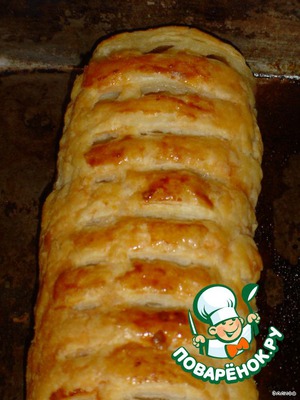 Сворачиваем рулетиком, делаем насечки, смазываем желтком и отправляем в духовку.