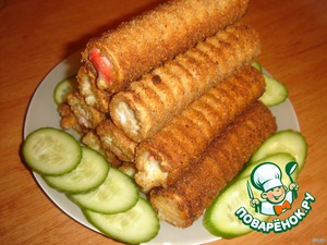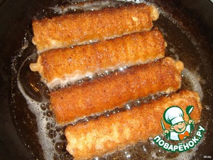 Обмакнуть каждую трубочку во взбитые яйца, а затем обвалять в панировочных сухарях.