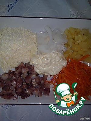 Сельдь почистить, нарезать небольшими кусочками. Ананасы также порезать небольшими кусочками, лук полукольцами. Сыр натереть на терке, добавить морковь по-корейски, майонез, добавить одну столовую ложку лимонного сока, зелень и перемешать. ;-)