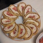 (праздничный вариант) Я уже давно "подсела" на эти рулеты - быстрая и вкусная закуска. Вот я и извращаюсь над начинками Эта понравилась мужу больше всего. Сначала может показаться, что начинки очень много (в принципе, так оно и есть - я взяла двойную норму), но результат того стоил - мягко, нежно и очень вкусно.
