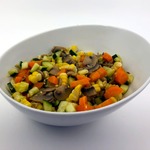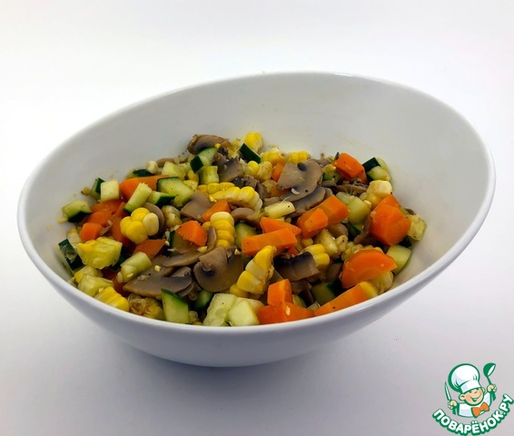 Подготовленные овощи перемешиваем и заправляем смесью растительного масла, соли, перца и лимонного сока.