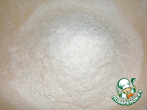 Для приготовления теста смешать муку с кокосовой стружкой, разрыхлителем, 100 г сахара, ванилином.