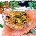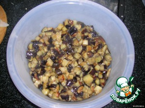 Баклажаны порезать кубиками и обжарить на растительном масле.