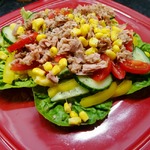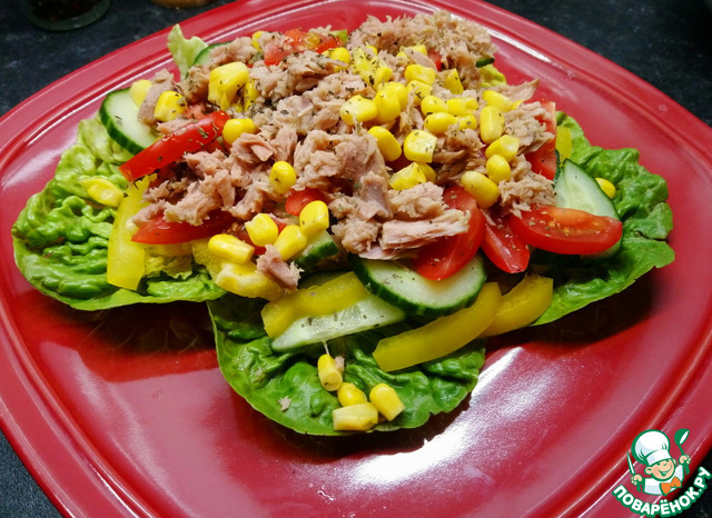 Листья салата, огурцы, помидоры, перец, тунец, кукуруза и майонез... Все это колечками порезать, положить слоями на листья салата. Приятного аппетита... Быстро и вкусно!!!
