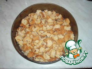 КЕКСЫ РАЗМЯТЬ(ИЛИ ПОЛОМАТЬ) И УЛОЖИТЬ НА ДНО ФОРМЫ. Сверху кексы полить коньяком (либо тем что у вас). У меня был ликер "Бейлиз" -
