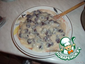 Заварной крем приготовить заранее, согласно инструкции, и охладить. Вишни смешать с кремом.