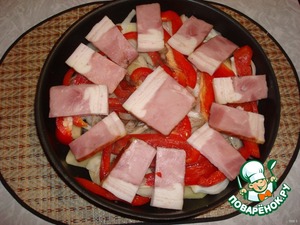 Бекон или ветчину нарезать полосками толщиной примерно 4 см. Уложить сверху.