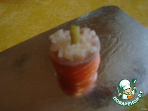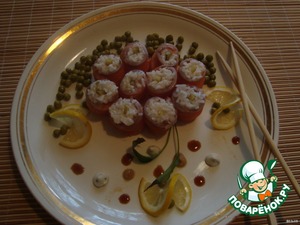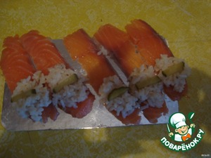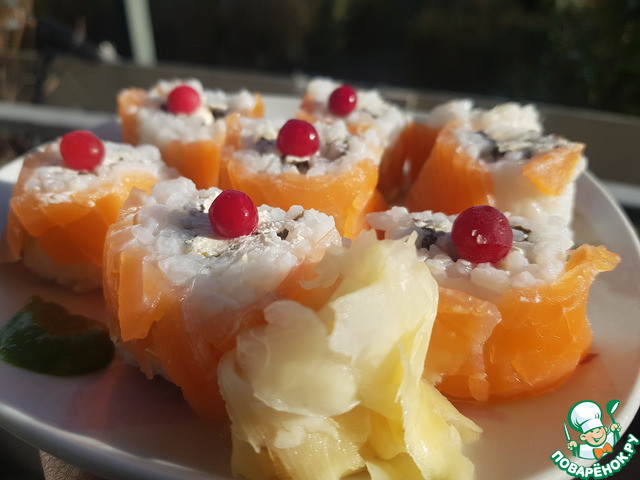 Так захотелось побаловать себя красной рыбкой, но просто съесть кусок, совесть не позволила... И тогда родился этот рецепт! Простой, вкусный и доступный каждому! Нет, я ни в коем случае не замахиваюсь на японскую кухню, но согласитесь, не всегда можно найти необходимые ингредиенты (нори, маринованный имбирь, васаби...) а так хочется чего-то необычного, праздничного и так, чтобы всем пришлось по вкусу...