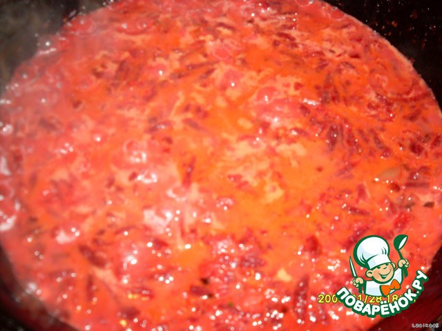 В бульон закидываем картошку и капусту. Варим до полу-готовности. Делаем зажарку: обжариваем лук до золотого цвета+чеснок, добавляем тертую свеклу, томат, резаный болгарский перец, 1 ст. л сметаны, чуть лимонной кислоты и 1 ч, л сахара. Тушим минут 10.