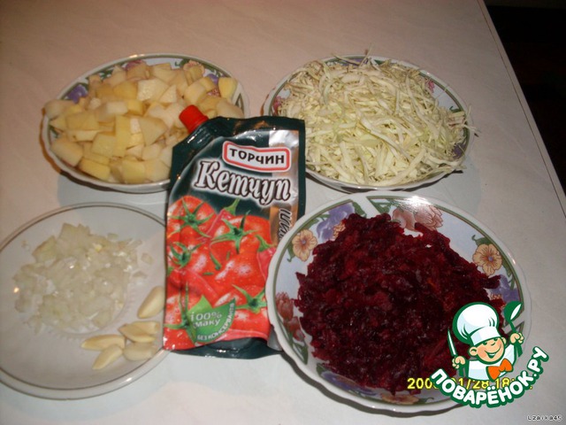 Картошку режем кубиками, капусту шинкуем, лук - кубиками, чеснок - меленько. Свеклу остужаем и трем на терке.