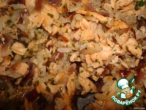 Луковицу обжариваем в небольшом количестве рас. масла (у меня была луковица тёмно-фиолетовая, она как-то странно смотрится на фото, как пригоревшая))), добавляем кусочки рыбы без костей (У меня были целые кусочки лосося, я их на 3мин. поставила в микроволновку и потом мясо рыбы легко отделилось от костей) .. через пару минут туда же отварной рис, зелень, немного соли и специи.