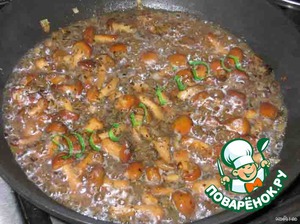 обжариваем на разогретой сковородке измельченный лучок до золотистого цвета, добавляем грибочки, соль, перчик, специи и тушим до готовности (пока жидкость не испарится)