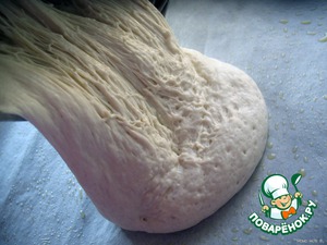 Далее выложить на лист, на котором будете выпекать. Я простелила противень бумагой, которую смазала оливковым маслом кисточкой – так и низ будет поджаристым. Тесто на лист прямо выливается – видите структуру? Покрыть пленкой, смазанной маслом (тесто очень липкое) и оставить на полчаса.