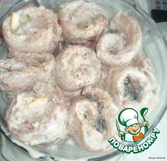 Свернуть филе рулетиком. И поставить его в вашу форму, предварительно застеленную фольгой (я забыла это сделать).