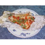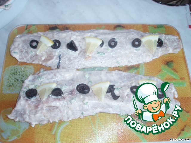 После берем замаринованное филе (ЕСЛИ ОНО БОЛЬШОЕ, ТО МОЖНО РАЗРЕЗАТЬ его по длине пополам), выкладываем сверху маслинки и кусочки лимона.