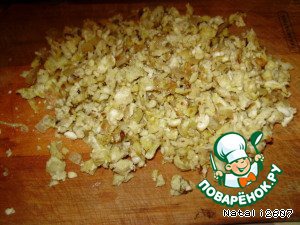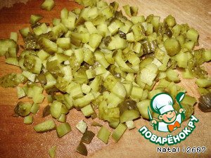 Маринованный огурец нарезать кубиком.