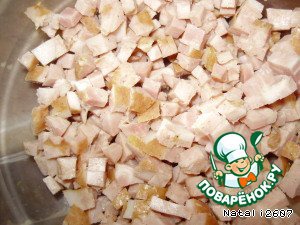 Копченое мясо нарезать мелким кубиком.