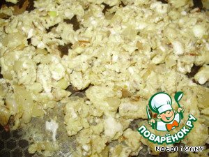 В сковороду к луку вылить взбитое яйцо и непрерывно помешивать, пока выпариться вся жидкость.