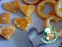 Из шляпок выдавить формой сердечки и ими украсить тарелочки с апельсинами. |