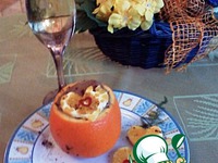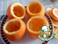 Апельсины помыть и вытереть на сухо. Верхнюю часть (шляпку) отрезать и отложить в сторону (она ещё пригодится) Вынуть из апельсина всю внутреньюю часть, чтобы осталась только кожурка в виде чашечки |