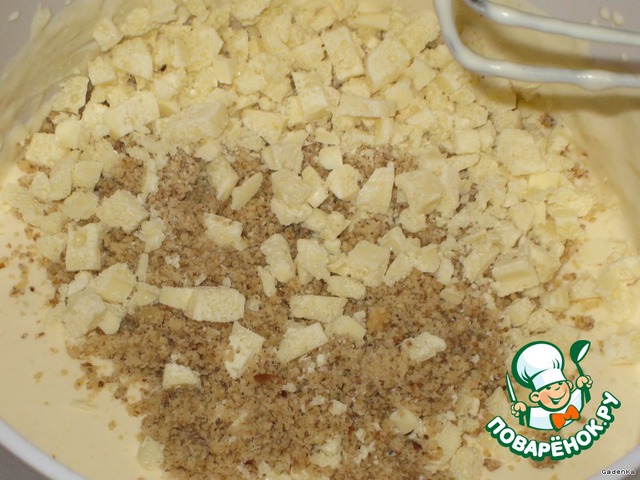 Затем добавить молотые орехи и шоколад, перемешать. -