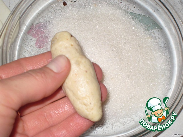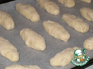 Слегка обмакнуть колбаску одной стороной в сахар и выложить на противень, сахарной стороной вверх.