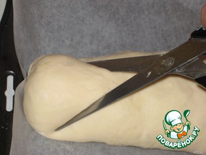 Если противень позволяет, оставить в длинном виде, я разделила на две части.