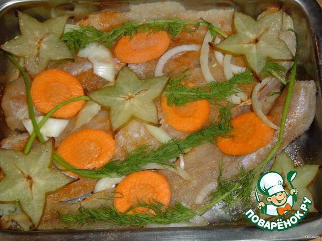 Рецепт «Рыба, запеченная под соевым соусом, с карамболой»: