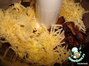 Трем сыр, обжариваем грибочки, добавляем желтки и все это отправляем в блендер