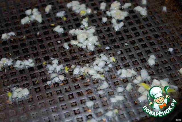 За это время делаем соус. В сковородке в небольшом кол. масла обжарить мелко нарезанный чеснок, мелкие кусочки перца и натертый имбирь (или порошок).