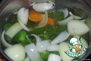 Брокколи, картофель, лук и морковь залить холодной водой и варить около 15 минут с момента закипания, при закипании посолить и за 5 минут до готовности добавить лавровый лист.